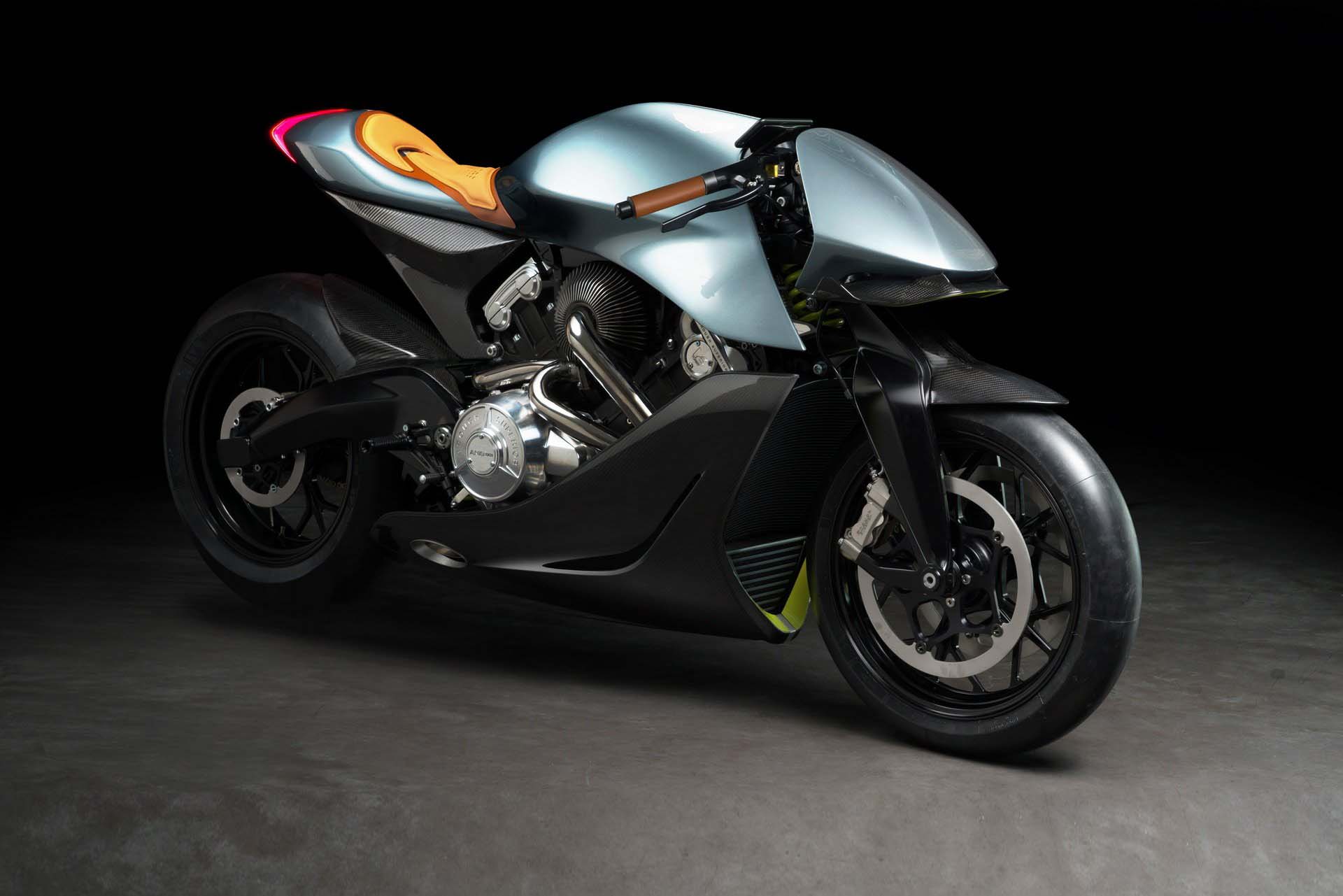 AMB 001 има рам од карбон-влакна, тежи само 180 килограми, а се придвижува со V-twin turbo мотор со 180 КС.